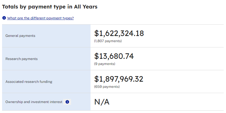From 2016 to 2022, Dr. Peter McCullough received the following amounts from drug and/or medical device companies, as reported by CMS Open Payments. The arrangement between pharmaceutical and medical device companies appears to present a significant conflict of interest. When physicians and researchers are compensated to participate in clinical trials or research, it raises doubts about the impartiality of the data. This situation seems highly dubious and calls into question the trustworthiness of such data to the public.