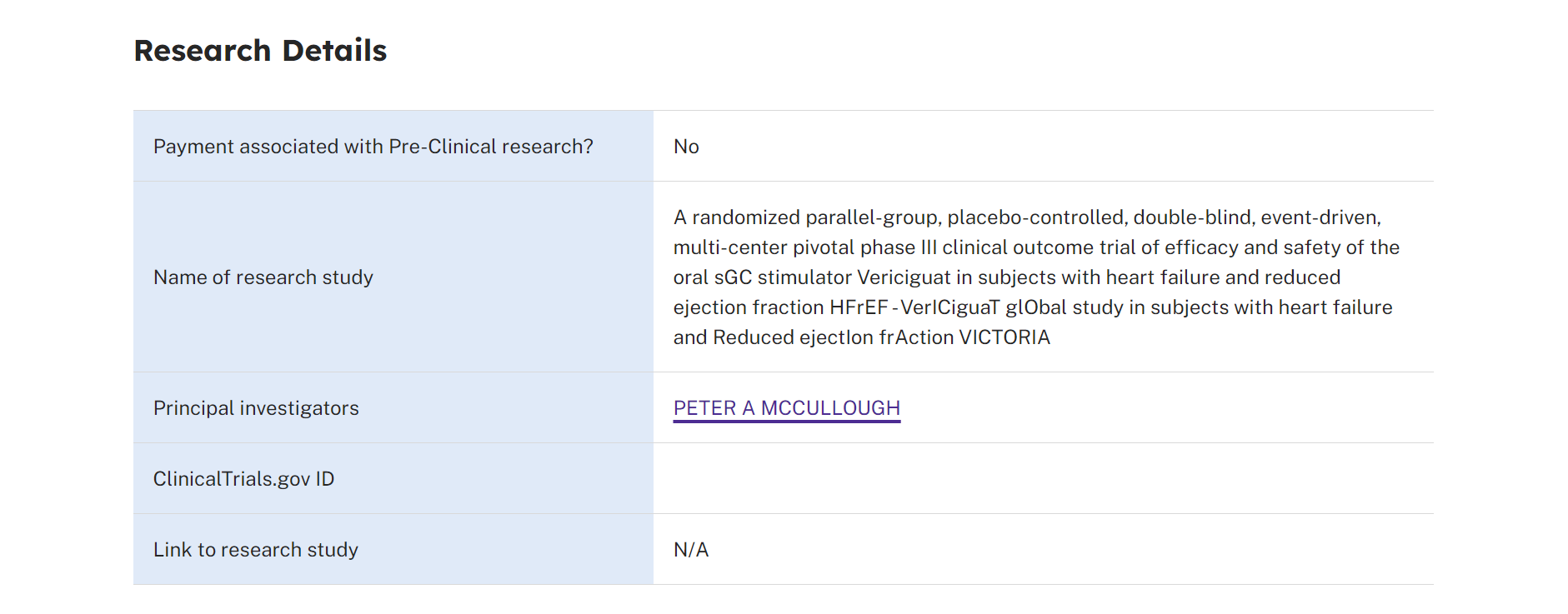 It seems that Dr. Peter A. McCullough, a well-known cardiologist, may have been involved as a principal investigator in this drug trial, as indicated by CMS Open Payments. However, details regarding his exact role in the trial are elusive and difficult to ascertain beyond this information.