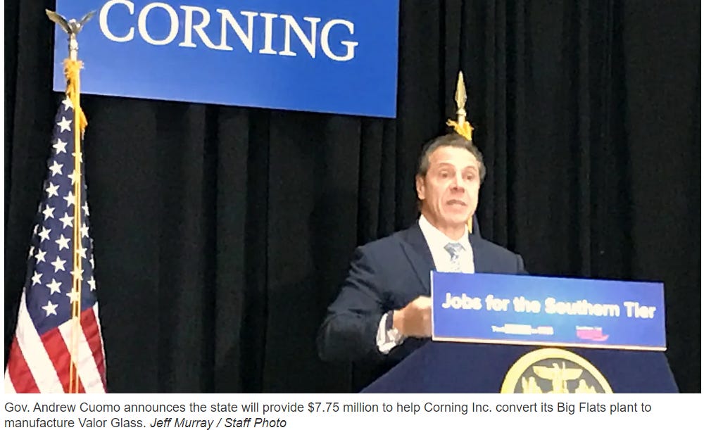 In November 2017, Corning Inc. announced plans to manufacture Valor Glass in the Southern Tier, creating 185 new jobs with support from New York state, including over $7 million in funding. Governor Andrew Cuomo visited Corning to unveil the state's financial assistance, emphasizing the importance of job creation and economic growth. Corning Valor® Glass, developed at Corning's Sullivan Park Research Facility was a project totaling $95.5 million. It generated employment at the Big Flats Innovation Support Center and Sullivan Park.