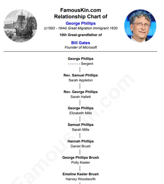 Through his mother Mary Maxwell Gates, Bill Gates traces directly back to Rev. George Phillips, a Great Migration immigrant who arrived in Massachusetts in 1630. Phillips was not a marginal settler. He was part of the clerical and civic leadership of the Massachusetts Bay Colony, a role that carried both spiritual authority and political influence. The Phillips family that descends from this origin became one of the foundational Boston Brahmin lines. Over generations, they embedded themselves into New England’s governing institutions, particularly education and theology. The founding of Phillips Academy Andover and Phillips Exeter Academy formalized what had already been occurring informally: the training of an elite class to govern future generations.