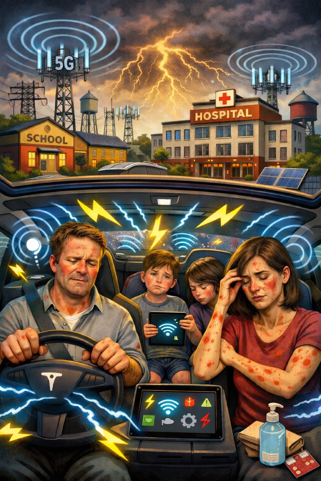 We are living inside a storm of electromagnetic exposure that is constant, dense, and unavoidable. Phones sit against our bodies from morning to night. Homes are filled with routers, smart devices, and wireless signals that never turn off. Cities are layered with cell towers and repeaters, the 5G rollout adding even higher frequency fields on top of decades of existing signals. Vehicles have transformed from mechanical machines into rolling electrical systems with massive batteries, power electronics, and constant connectivity. Solar plus battery systems, smart meters, and energy storage equipment surround our homes and schools. We are living inside something that no previous generation has experienced, and our bodies are responding.