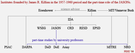James Killian was the most central player in the creation of all these civilian research institutions under Eisenhower. He not only founded IDA in 1957, but also the President's Science Advisory Committee (PSAC), and became chairman of both. In 1958, he established ARPA and as head of IDA, he approved the proposal to create the JASON Group. In 1958, Killian was also asked to create the Communications Research Division (CRD) within IDA, a Princeton-located top secret think tank for the NSA. Then, in 1959, Killian oversaw the creation of MITRE. He became a trustee of MITRE in 1960 and from 1967 to 1969 he was chairman of the board of trustees of this think tank, which was very similar to IDA and RAND. He remained on the board until 1982. In 1960, together with the earlier-mentioned William O. Baker and JASON scholars Richard Garwin and Sidney Drell, Killian was a co-founder of the National Reconnaissance Office (NRO), an intelligence agency that remained secret for about a decade - although its existence was only announced officially after the Cold War had ended. [5] Back in 1957, Vannevar Bush is said to have suggested Killian as the follow-up to defense secretary Charles E. Wilson, but Eisenhower selected Neil McElroy instead.