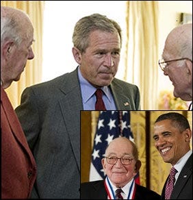 Jan. 28, 2003, Village Voice, 'The Empire Strikes Back': "This Saturday, more than a thousand of America's top military and government leaders and their guests are scheduled to gather at the Omni Shoreham Hotel in Washington, D.C., for a secretive tribal rite called the 103rd Annual Wallow of the Military Order of the Carabao. ... Recent guests have included Colin Powell and General Richard B. Myers, current chairman of the Joint Chiefs of Staff, and many of the country's top military leaders are listed as members. (You have to be an officer to even be considered for membership.) Acting like a cluster of Klingons, the guys will toss around revered imperial slogans, such as "Civilize 'em with a Krag!" referring to the rifles used by Americans to kill thousands of Filipinos, who had fought Spain for their freedom and didn't want to be handed over to another colonial power. And there will be rousing speeches, like last year's address by top honoree James Schlesinger, the Nixon-era CIA director and defense secretary, who decades later is still an influential hawk urging a new war with Iraq. A place was reserved at the head table for President George W. Bush, who was a no-show, but Schlesinger, who received the Carabaos' Distinguished Service Award, delivered an appropriately bellicose speech, telling the crowd, "Someone once said that war is hell, and peace is heaven. But we know that the opposite is true: War is heaven, and peace is hell." An aide to Schlesinger told the Voice late last week that Schlesinger said he recalls saying, "You know, General Sherman had it all wrong. It's not war that's hell, it's peace that's hell." The aide added that Schlesinger didn't have time to talk further about the Wallow but that what he told the crowd was a "humorous remark made in reference to the defense budgetary situation." ... Ancient Strom Thurmond was plunked down at the 2002 Wallow's head table, where he was assigned a cigar alongside those reserved for Schlesinger, General Myers, Pete Aldridge (the Pentagon's chief of acquisition, technology, and logistics), Dov Zakheim (the Pentagon's comptroller), Gordon England (top deputy to Homeland Security czar Tom Ridge), Sean O'Keefe (the NASA director), and other bigwigs. Marine General Peter Pace, the vice chair of the Joint Chiefs, and Air Force Secretary James Roche, both Carabaos, were assigned the roles of hosting tables of their own. Among the assigned greeters was last year's Grand Paramount Carabao, General P.X. Kelley, a retired commandant of the marine corps, whose last real tour of duty was the 1992 GOP presidential primaries, when his pro-war TV pitches helped deliver the South for George Bush the Elder against isolationist Pat Buchanan. Joining Kelley on the Reception Committee were General Alfred M. Gray Jr., the marine commandant during the previous war with Iraq; Admiral Thomas H. Moorer, a chairman of the Joint Chiefs during Vietnam; and an assortment of other admirals and generals. ... Carabaos pop up in other situations involving minorities or others fighting discrimination. The last all-male Advisory Council at the Citadel, the South Carolina school that was the scene of serious gender discrimination battles in the '90s, was chaired by retired army general Jack Merritt, a Carabao, and included at least three other bulls: Moorer, retired marine commandant General Carl Mundy, and retired Atlantic Fleet chief Admiral Wesley McDonald."